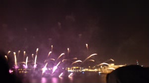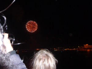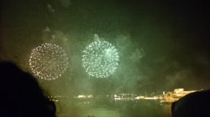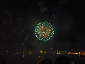 風が吹いてきてちょっと肌寒い感じ。なかなか始まらないと思ったら22時からでした。 POPな音楽に合わせての花火は、日本の花火とはちょっと違って面白かったです。 |