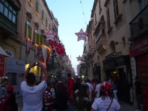 近くのバス停から中心地のヴァレッタまではバスで40分ほど。目抜き通りでは大パレード。何!?と思ったら、ヴァレッタのサッカーチームがリーグ戦で優勝したらしい。ものすごい盛り上がりを見せてます。 |