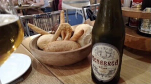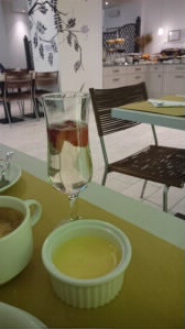 スプマンテに苺をトッピング♪ ドリンクのところに、普通の水と、ガス入りの水もあります。甘いパンもたくさん! |