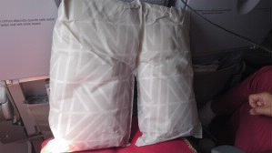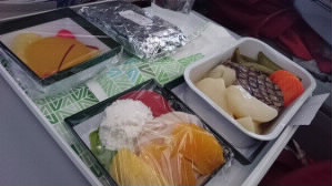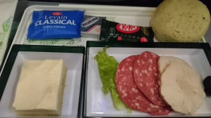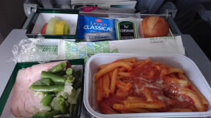 左:旦那様はグルテンフリーの機内食をチョイスしたので、一般の配膳より早く食事が来ます。4月時点では「糖尿病食」はなかったので、グルテンフリーを選択しましたが、5ヶ月後の9月にイタリア出張の際は糖尿病食ができてました。グルテンフリー食は米粉パン。米粉ならいいの?糖尿病は、米粉はNOよね〜。 下:アリタリアの食事、昔は美味しかったのになぁ。スプマンテもあったし、レジャーノも塊を自分で削ったのよね〜。随分寂しい食事になっちゃいました。 |