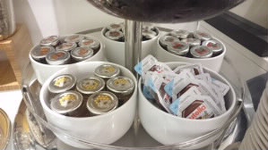 ジャムのところに、はちみつの小瓶とヌテッラ。 イタリアだわ〜ww |