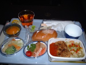 今回はバンコクまでJALで、マイルを貯めます。JAL717 11:05発です。 下はお約束の機内食。 きじ焼き丼か、かじきのフライの選択で、 私はきじ焼き丼を・・・ |