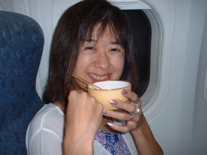 機内食にいかにもタイフードという、牛肉スライスのあんかけ&ご飯が出ました。 (タイフードが苦手な旦那さまは眉間に皺が・・・) 食器がプラスチックだけど、イエローというか、ブラウンというか、この色で統一され、ピクニック用のようにかわいらしいものでした。 食べるのに夢中で食器を撮らなかったから帰りにね(^^;;; |