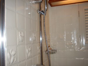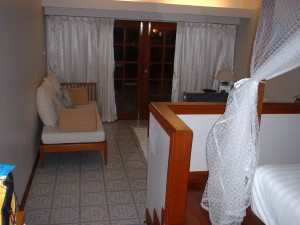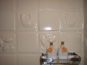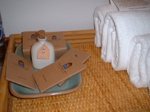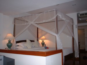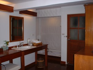 お部屋に入って天蓋付のベットとバスタブとシャワールーム、トイレ、洗面所。 シャワールームのタイルがカニや魚の柄でかわいいです。 アメニティーのシャワーソープやローションの入れ物が素焼きで、これまた素敵♪ |