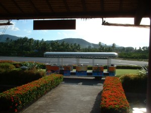 サムイ空港までは40分程でした。 空港に着くと、到着ロビーまでの移動バスは、遊園地の中を移動するような、可愛らしいバスが、到着飛行機目指して、突進してきます(笑) |