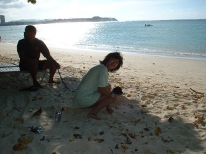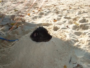 そしてビーチでひとやすみ〜! 見てみて!わんこが砂の中に(笑) きっと涼しいんだね。 ご主人様が穴を掘ると、ちょこんと入るの。 |