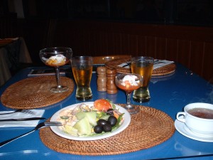 夕飯はNana's!外はBBQでしたが、私たちは部屋の中のコース料理を選択。 私がオーダーしたのはセットものになっていて、サラダバーと前菜と、スープがついていました。 ←ブラックオリーブ好きの私(^^;;; |
