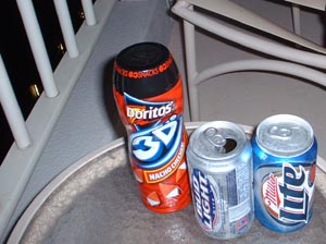 帰りにセブインイレブンでビールとお菓子をゲット。 ドリトス3D(笑)立体的なの。 小さいけど、おいしかったです。 ホテルのベランダで夜景を見ながら(^^) |