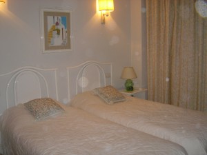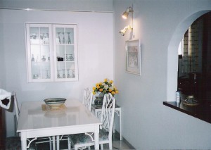 玄関を入るとダイニング。その奥がキッチンです。 白いで統一された家具、あちこちにあるスペインらしい風景の絵。 ダイニングや寝室の造花は黄色でコーディネートされ、明るくて、とても素敵なお部屋です。 |