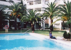 これがプールです。 写真の左から2つ目、下から3つ目のバルコニーが”我が家”です。 |