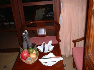 ウェルカムフルーツの中に大きくて赤いドラゴンフルーツが!明日たべよ〜っと♪ ミネラルウォーターとガス入りのミネラルウォーターが、それぞれ1本ずつ。毎日補充してくれます。 |
