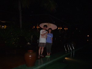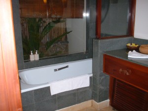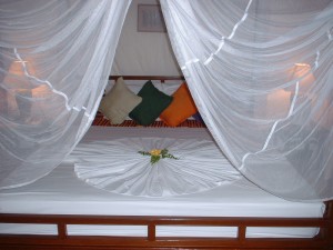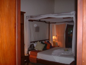 今回も天蓋付き! というか、昨年のサムイのトンサンベイホテルは天蓋でしたが、今回は「蚊帳」。ベットメイクのときには蚊帳をおろしに来てくれます。 |