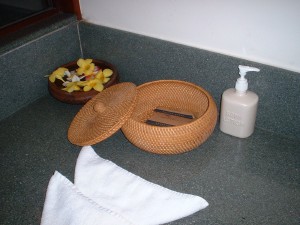 アメニティー入れはアタでできているかわいいバスケット。お花も水に浮いていて、ビーチリゾート満喫です。 |