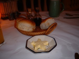 まずはパン。 バターはこのホテルのマークがかたどられていました。 パンが乗っているのはアタで編んだかご。その中にオリーブオイルとバルサミコ酢のボトルも乗っています。 かごであれば、焼きたてほかほかのパンの蒸気も逃げていいですよね! |